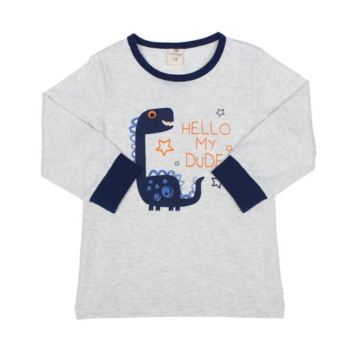 - Bộ quần áo có màu ghi rất thời trang cùng họa tiết chú khủng long ngộ nghĩnh sẽ khiến gu thời trang của bé thật nổi bật và trẻ trung, hiện đại.